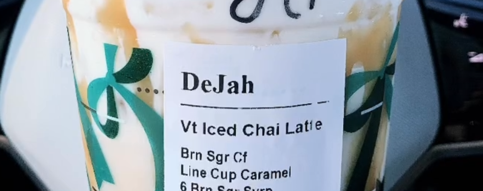 Can I please get a (insert size) iced chai tea latte with four pumps of brown sugar syrup? I would like the cup lined with caramel and topped with brown sugar cold foam, along with a cinnamon dolce topping.